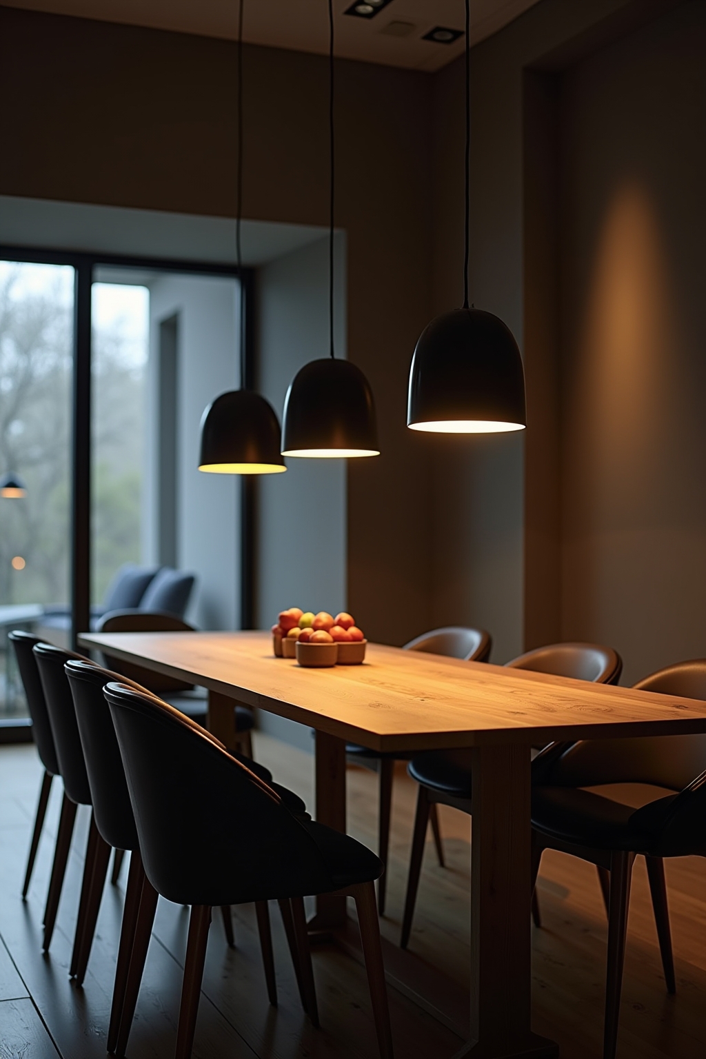 - Lampen op verschillende hoogtes creëren visuele dynamiek boven de eettafel.