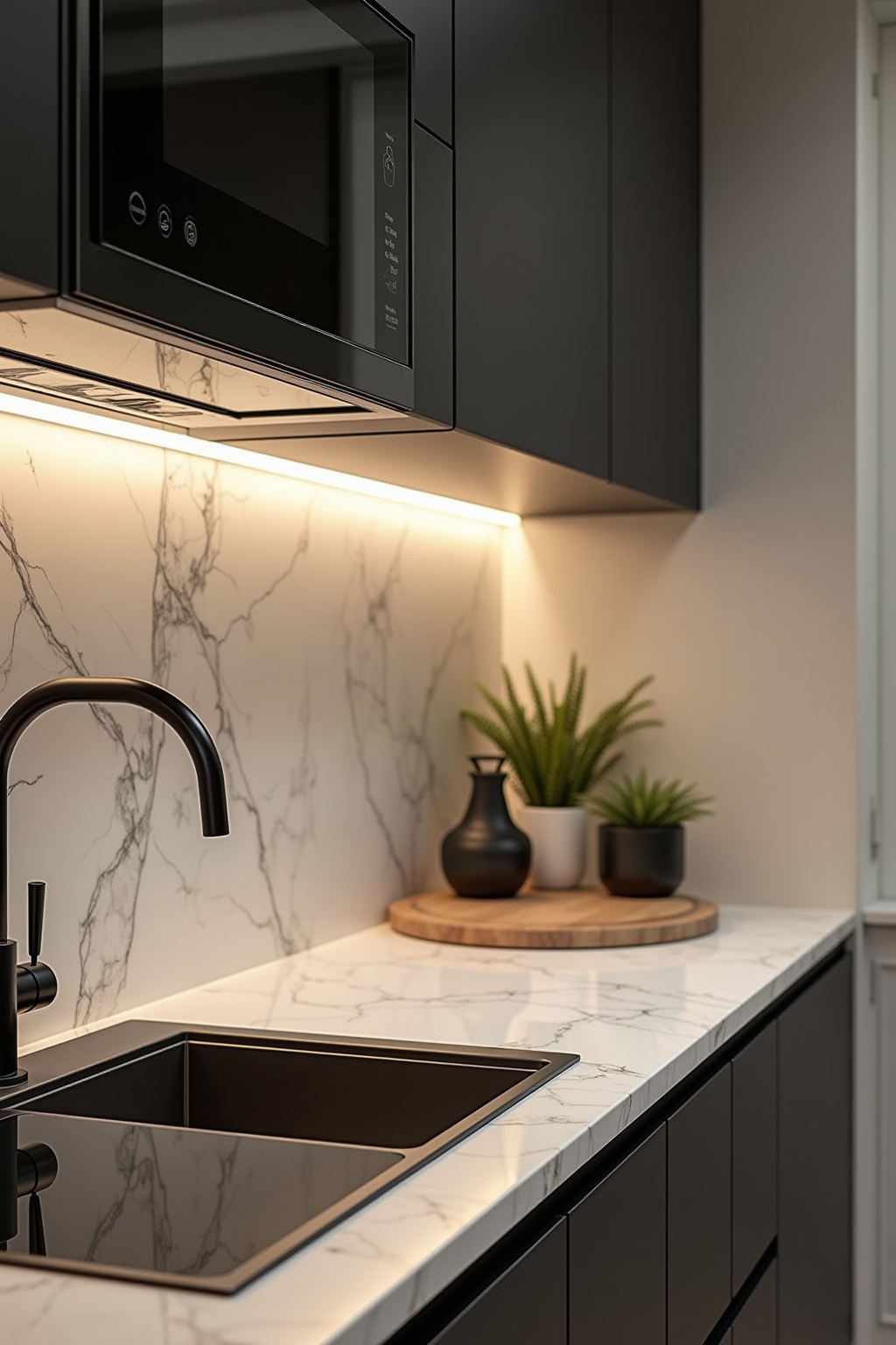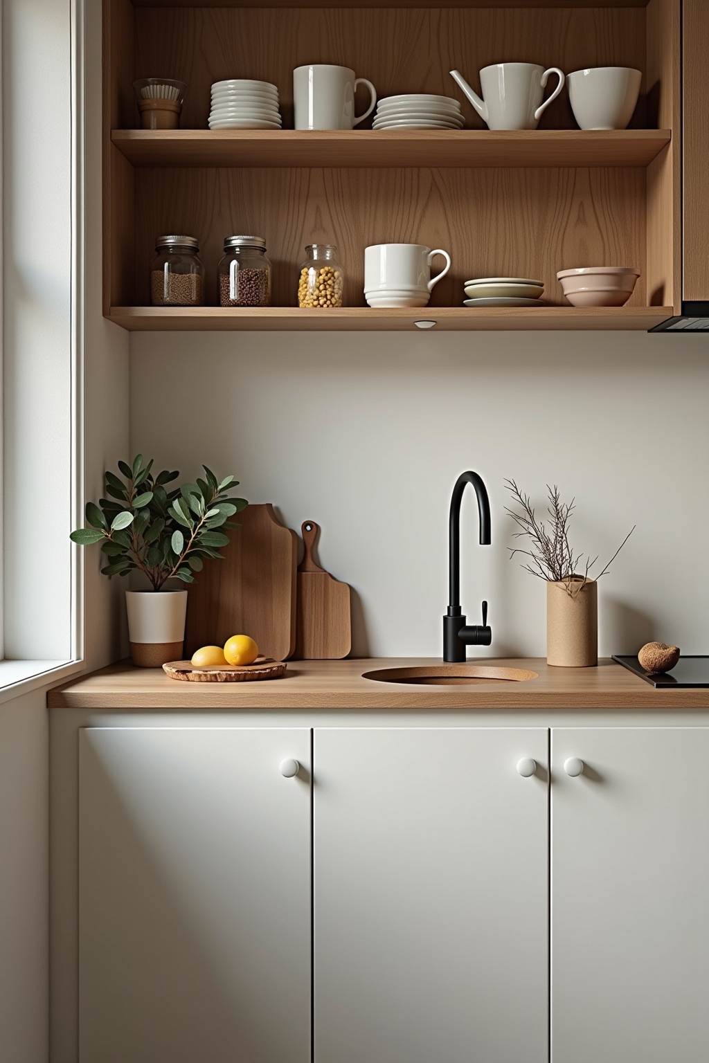 Met een kleine keuken kan het aanrechtoppervlak snel vol raken, maar met de juiste decoratie-oplossingen creëer je toch een functionele en stijlvolle ruimte. Kies voor wandplanken boven het aanrecht om keukenaccessoires op te bergen, zodat je waardevolle werkruimte vrijhoudt voor het bereiden van maaltijden. Magnetische messenrekken of kruidenrekjes aan de muur zijn niet alleen praktisch maar voegen ook een decoratief element toe zonder kostbare aanrechtruimte in beslag te nemen. Multifunctionele items, zoals een snijplank die over de gootsteen past of een decoratieve schaal die ook als fruitschaal dient, combineren functionaliteit met stijl in een beperkte ruimte. Door te kiezen voor een minimalistisch kleurenpalet en slechts enkele zorgvuldig uitgekozen decoratieve elementen, creëer je visuele rust waardoor je kleine keuken groter en ruimer aanvoelt.