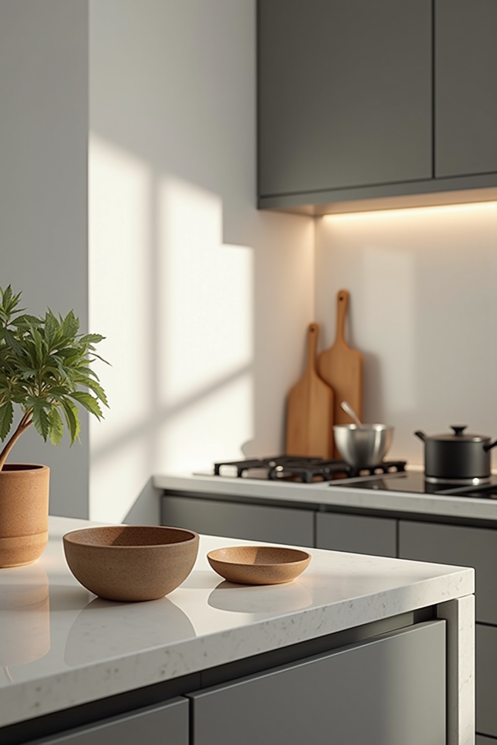 Bij een compact werkblad is het essentieel om verticale ruimte te benutten met wandrekjes of hangend kruidenopslag in plaats van decoratie die kostbare werkruimte inneemt. Kies maximaal twee decoratieve items die echt impact maken in plaats van meerdere kleine spulletjes die rommelig ogen. Multifunctionele decoratie verdient de voorkeur: denk aan een stijlvolle olijfoliekan die zowel mooi als praktisch is. Vermijd grote fruitschalen of decoratieve items zonder functie die het aanrechtoppervlak verkleinen. Gebruik reflecterende materialen zoals glas of gepolijst metaal die licht weerkaatsen en de ruimte groter doen lijken. Zorg dat decoratie niet voor keukenkastjes staat zodat toegankelijkheid behouden blijft. Door regelmatig op te ruimen en alleen dagelijks gebruikte spullen op het werkblad te houden, creëer je een functionele en esthetisch aantrekkelijke keuken ondanks beperkte ruimte.