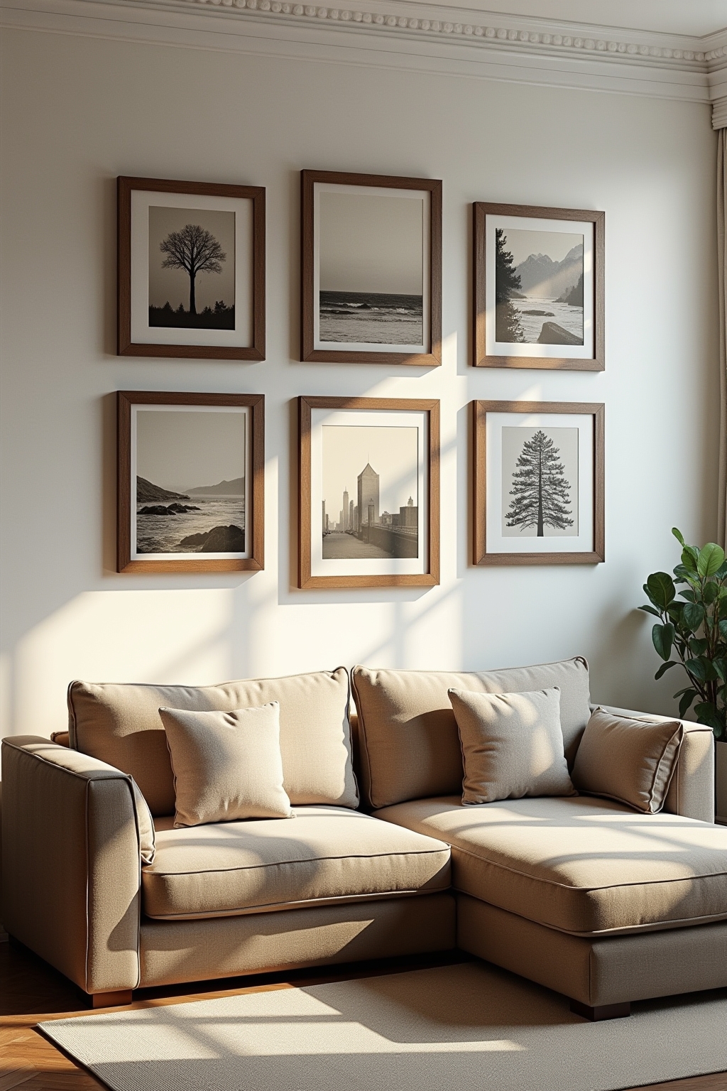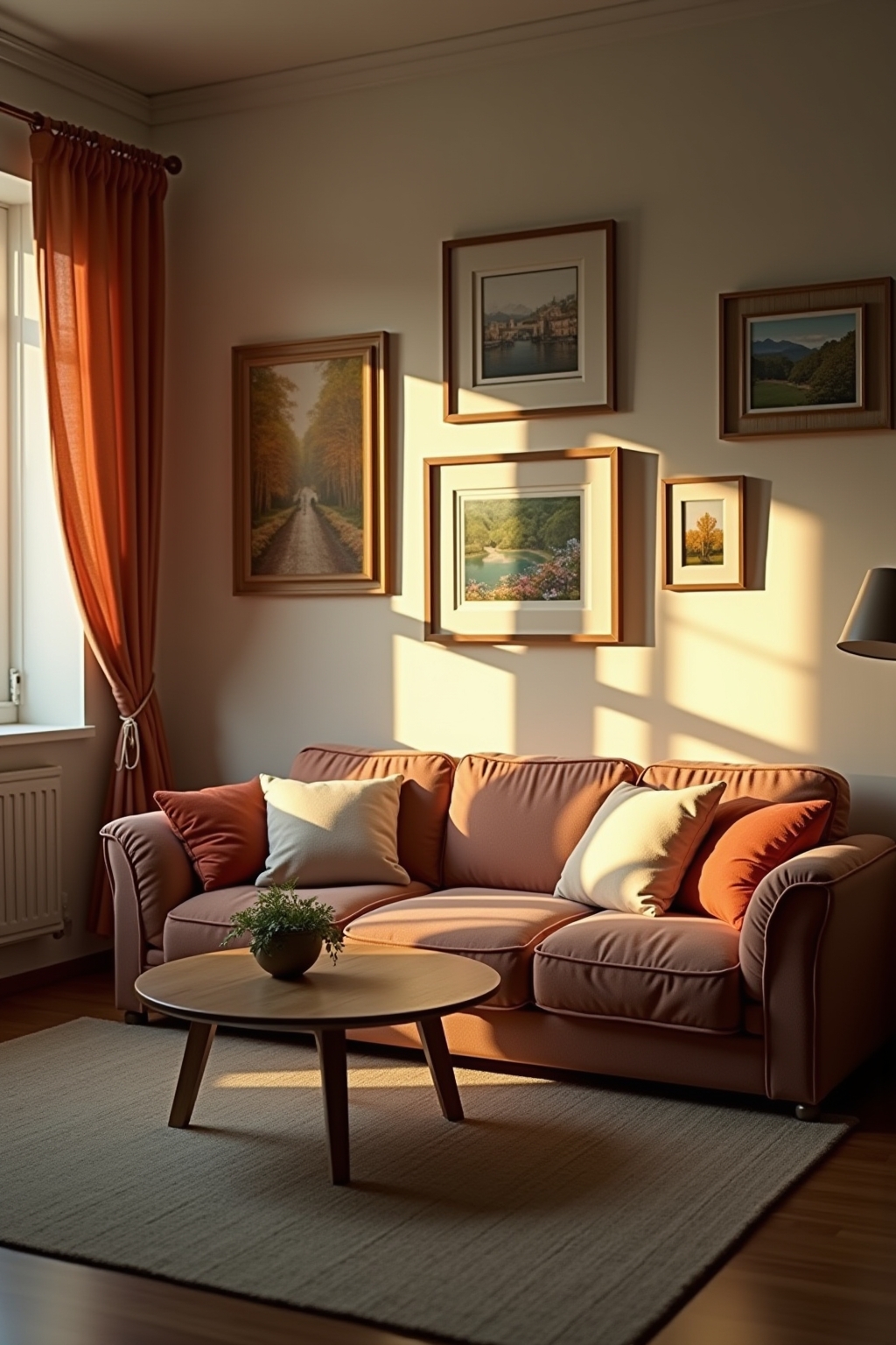 - Een goed muurdecoratie ensemble creëert visueel evenwicht in de woonkamer