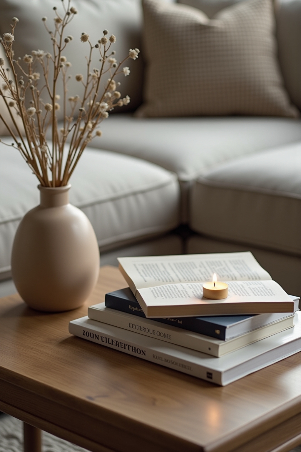 Perfecte balans: Combineer decoratieve elementen met functionele items zoals boeken of schalen voor een praktische én stijlvolle salontafel.
