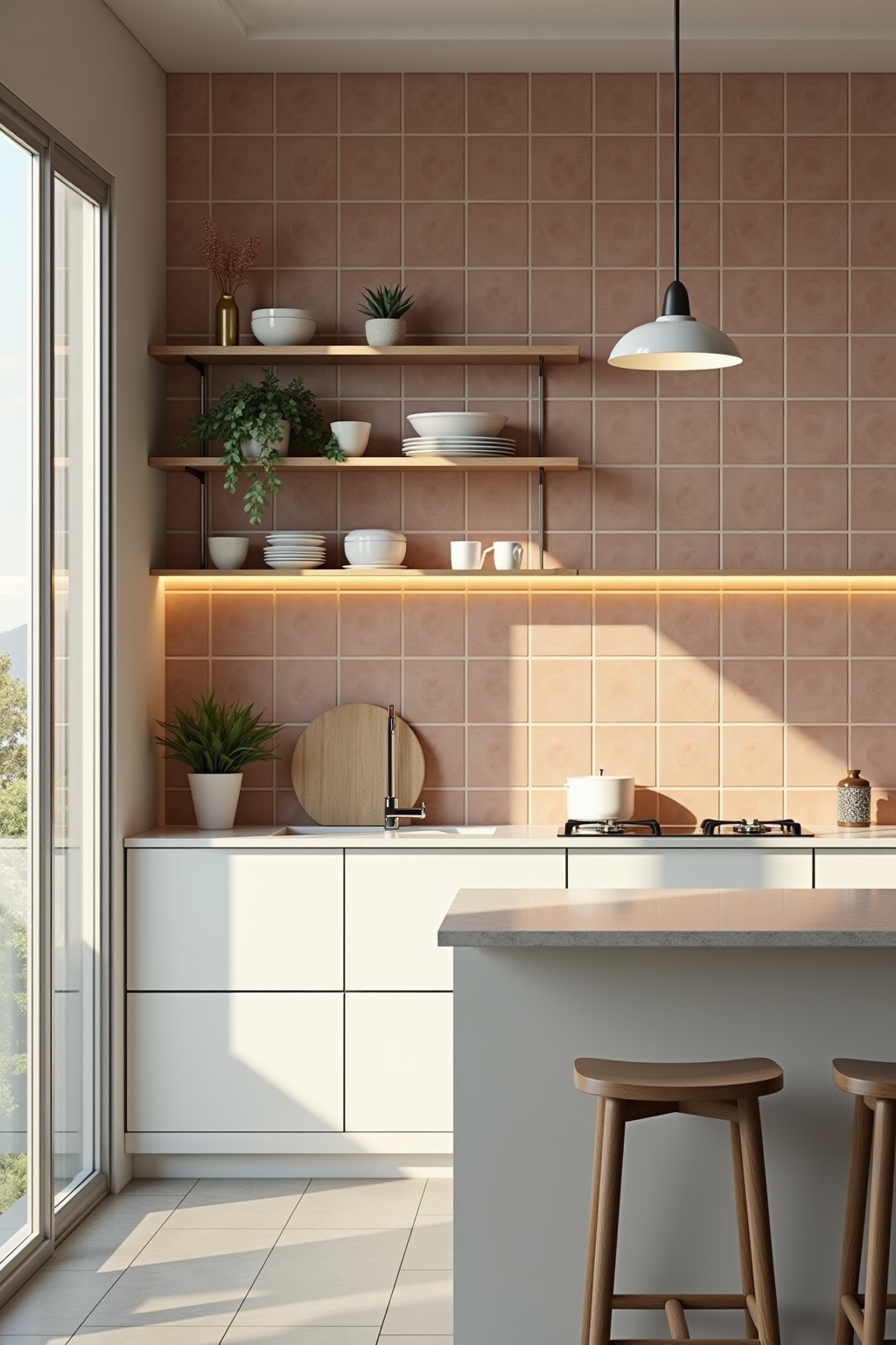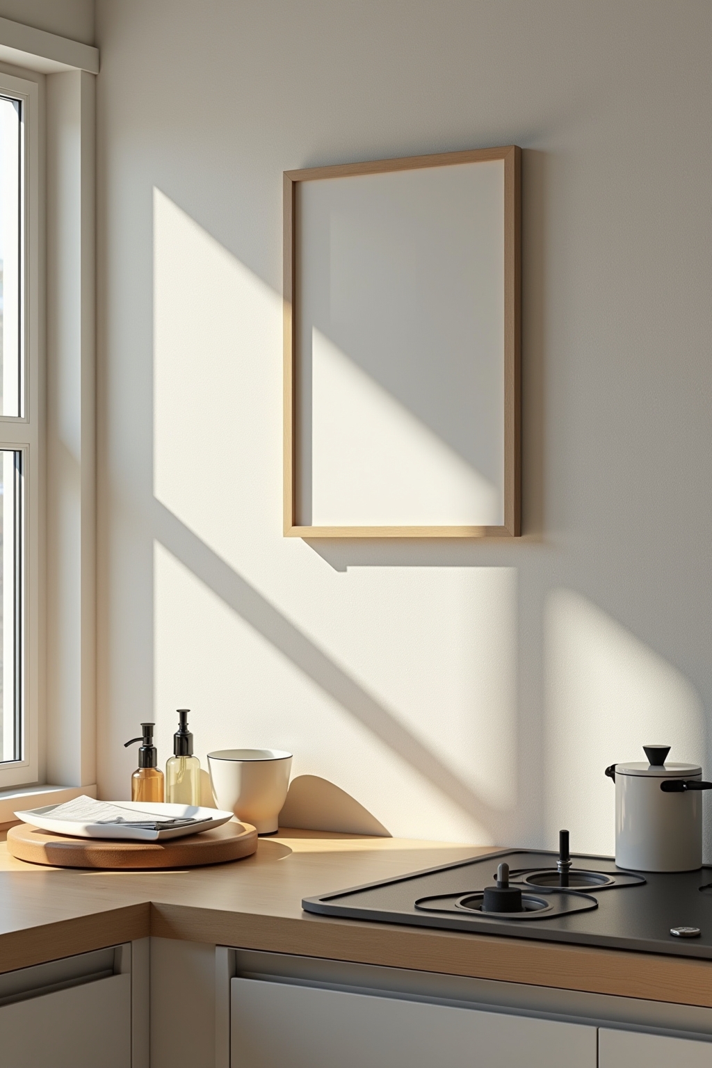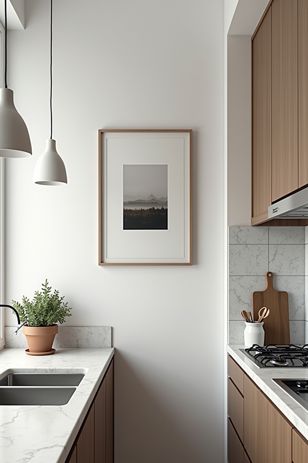 - Minimalistische wanddecoratie biedt rust en ruimte in de keuken.
