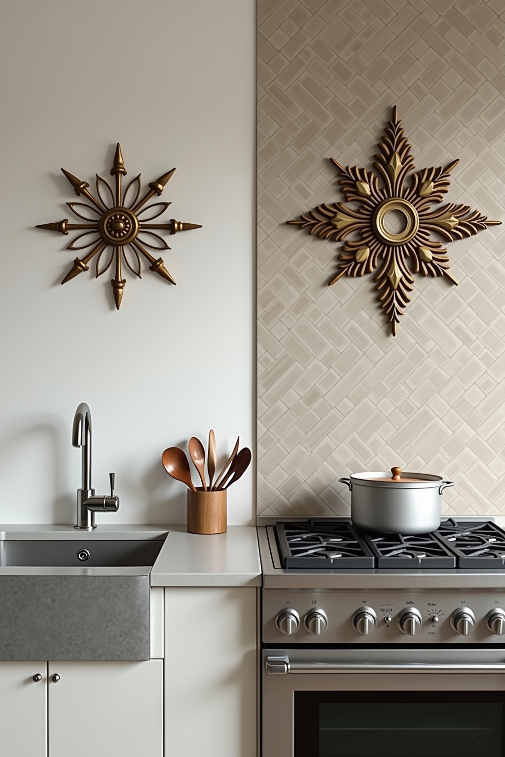 Voor een harmonieuze combinatie van keukenwanddecoraties, kies een overkoepelend kleurenschema dat aansluit bij je keukeninrichting. Creëer een visueel evenwicht door grotere muuraccessoires te mengen met kleinere decorstukken. Varieer in texturen – combineer bijvoorbeeld gladde metalen elementen met ruwere houten objecten voor diepte en contrast. Groepeer gelijksoortige wandversieringen bij elkaar in een galerij-opstelling voor maximale impact. Houd rekening met de proporties van je keukenruimte; in kleinere keukens werkt één statement-stuk beter dan meerdere kleine muurdecoraties. Zorg voor een logische visuele flow door wandornamenten op één lijn of in een doordachte compositie te hangen. Behoud samenhang door een terugkerend thema of stijlelement in verschillende muurdecoraties te verwerken, zoals natuurmotieven of geometrische patronen.